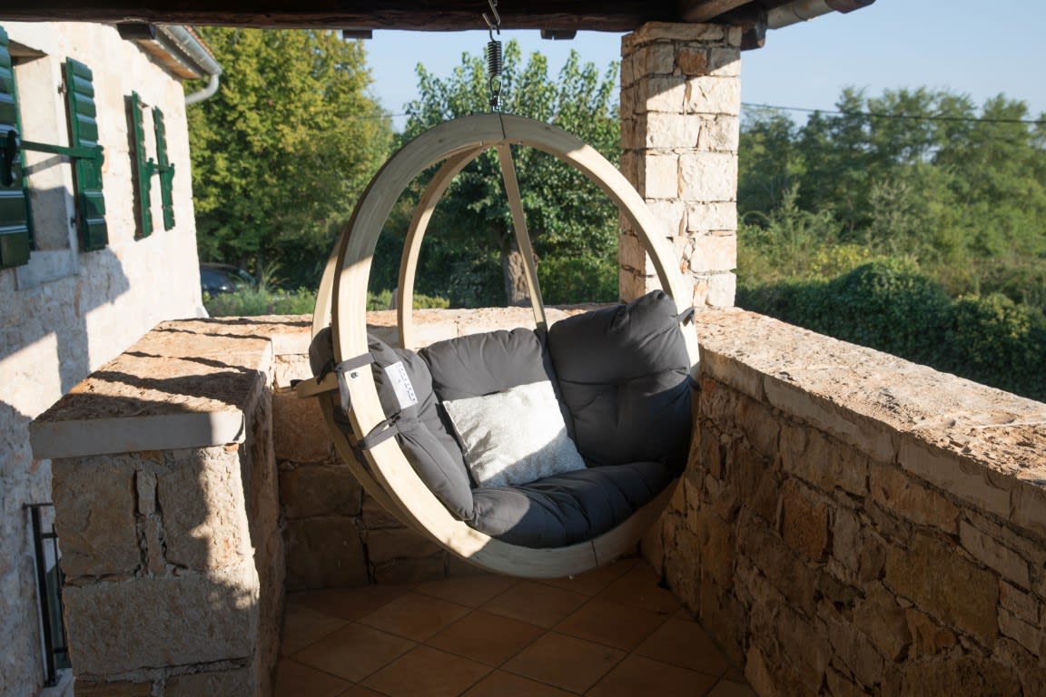 Vom Wohnzimmer aus hat man direkten Zugang zur schönen überdachten Terrasse, die mit herrlich bequemen Lounge-Möbeln ausgestattet ist. Hier ist es besonders abends gemütlich, wenn man den Tag bei einem Glas Wein ausklingen lassen möchte. Von der Terrasse aus hat man einen weiten Blick in die umliegende Landschaft. Im Globo-Hängesessel kann man sich mittags in den Schatten zurückziehen oder am Abend besonders schön den Sonnenuntergang beobachten.